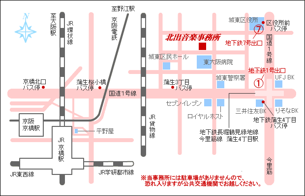 ※北口改札を出て右側にある平野屋の右又は左の道を行き、京阪電鉄の高架線路沿いに進むと国道1号線に出ます。